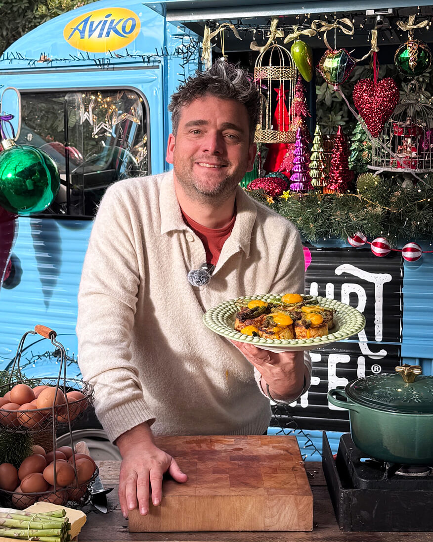 Geroosterde groene asperges met boerenkaasgratins, gepocheerde eidooier en basilicumhollandaise